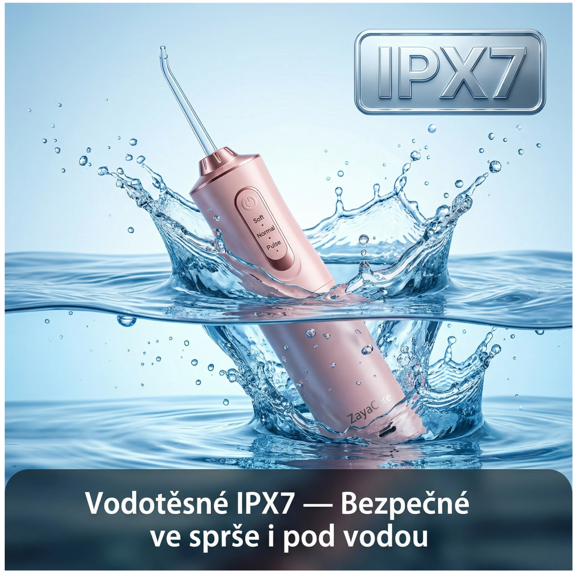 ZayaCare je certifikovaný IPX7 — to znamená, že ho můžete bezpečně používat ve sprše, oplachovat pod tekoucí vodou nebo dokonce ponořit do vody. Žádné obavy z vlhkosti v koupelně.
